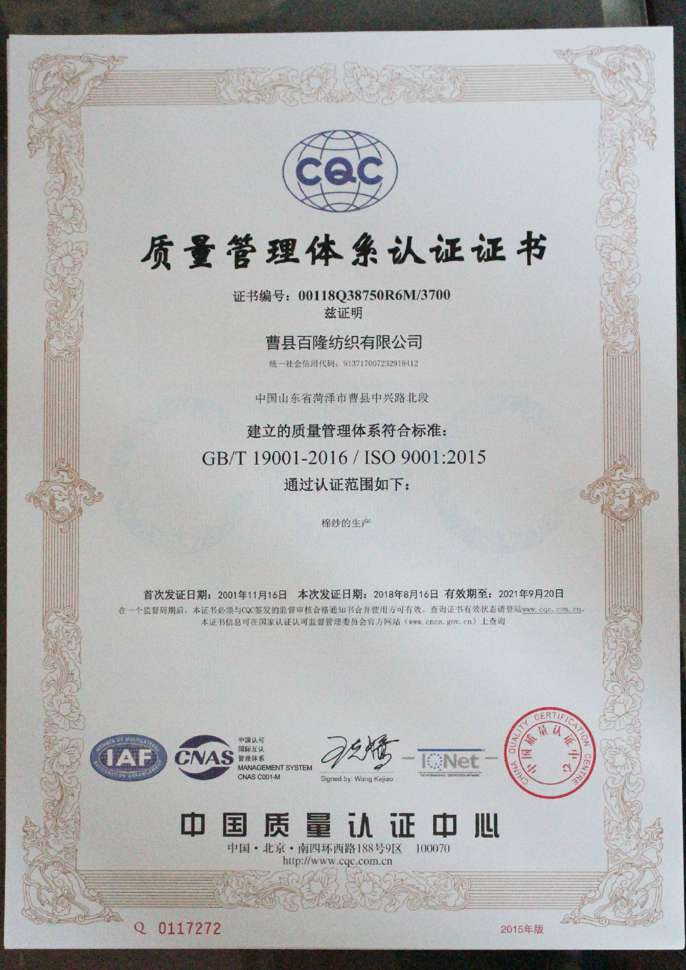 一是精准落实各类标准及国际认证体系的规范运行。例如:曹县百隆于2001年11月首次获得ISO9000质量管理体系认证,至今运行近18年。多年来,企业不仅将质量管理体系作为有效控制产品质量在生产过程中的重要对标工具,更是伴随着该认证体系的不断迭代升级而升级,当下应用的是ISO9001:2015版标准。企业通过脚踏实地的规范运行,持续改进提升质量,随时确保同国际公认的质量管理标准保持一致,持续稳定地为顾客提供预期和满意的合格产品。