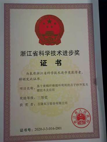 百隆东方与江南大学合作开展的“基于废棉纤维循环利用的点子纱开发关键技术及应用”科研项目,经过多年的研发与实践,得益于其生态低碳,可循环再利用等技术特性,荣获了2021年浙江省科技进步三等奖。当下,百隆不断探索将该技术引伸到色纺纱新品研发的多组分废旧纤维领域,协同下游服装产业链企业共同探索对服装废布料、旧服装的循环再利用,不断研发推出的循环利用再生系列产品,已在生产和销售中占有一席之地,获得了较好的社会反响和经济效益。