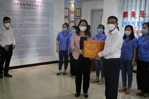 图为:百隆(越南)领导和员工接受来访的越共和国家领导的慰问