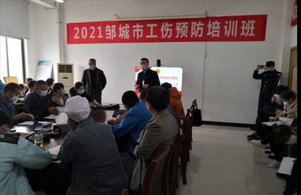 上图为:2021年11月3日山东百隆联合邹城市社保局工伤科对新入职员工进行工伤预防知识及安全消防知识培训