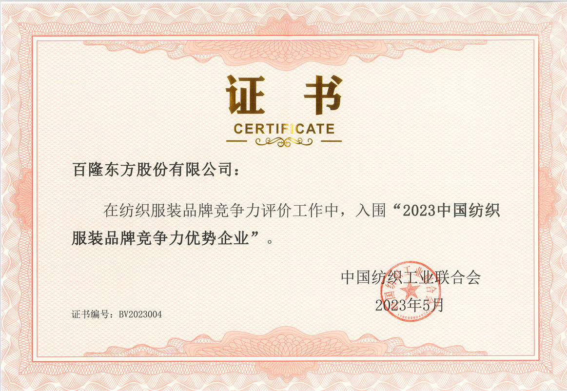 中国纺织工业联合会以相关国际标准、国家标准为基础参照,制定纺织服装品牌价值评价体系,优化建立测算模型,组织开展了 2023 年纺织服装品牌竞争力评价工作。未来,百隆东方将继续坚持走“一根纱精品”路线,秉承“技术创新是不可复制的核心竞争力”的理念,遵循“用心引领色纺潮流,为顾客提供优质和环保健康的色纺纱产品 ”的质量方针,扎实推进,稳健发展。